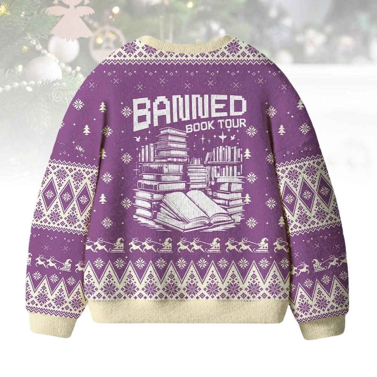 Banned Book Tour Reading Lover Ugly Christmas Sweater Purple Holiday Knit Pullover Gift