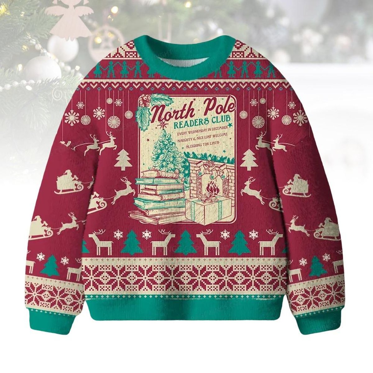 North Pole Readers Club Ugly Christmas Sweater Vintage Santa Book Lover Holiday Knit Pullover