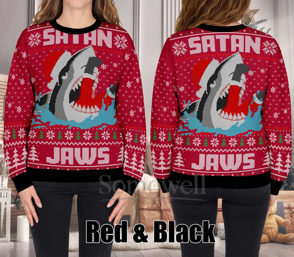 Satan Jaws Shark Ugly Christmas Sweater Funny Navy Knit Jumper Holiday Gift