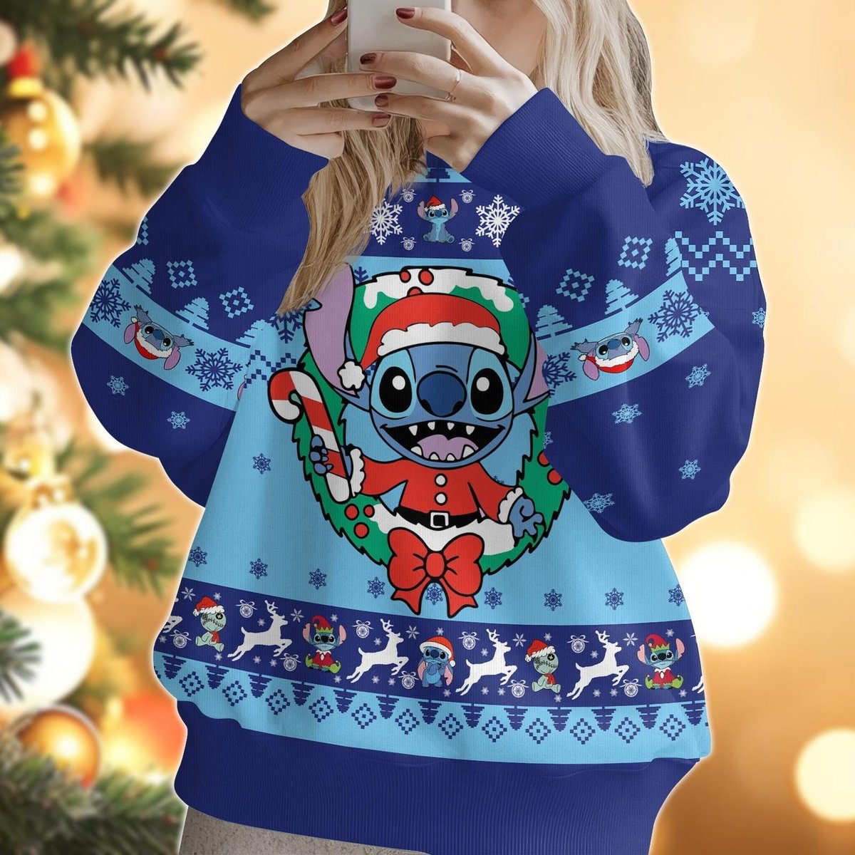 Santa Stitch Wreath Ugly Christmas Sweater Blue Cute Holiday Pullover Gift