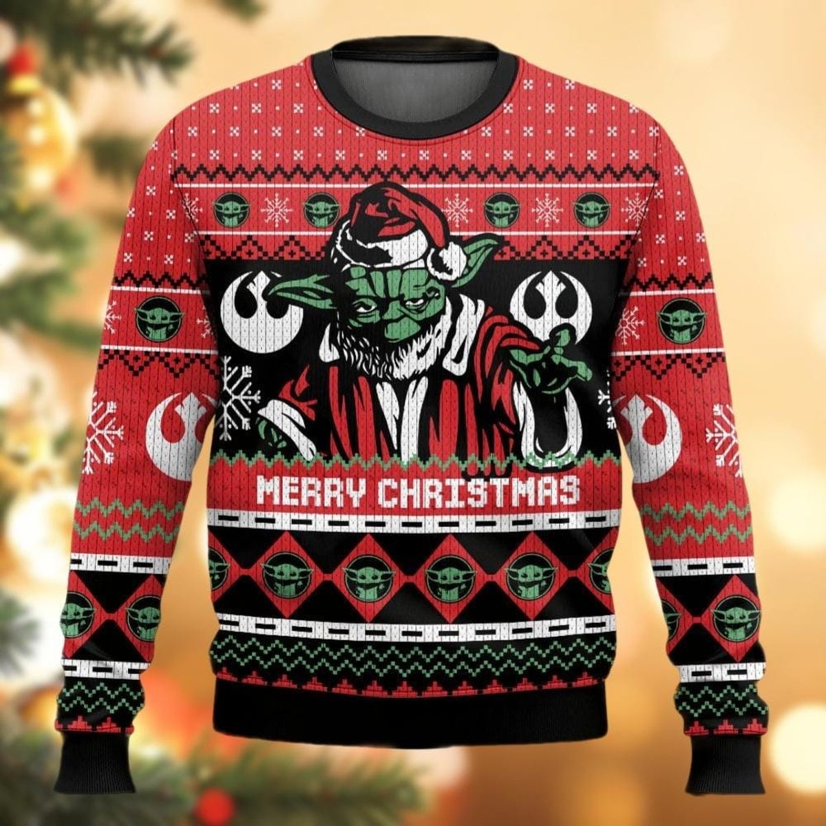 Santa Yoda Merry Christmas Ugly Sweater, Red Green Galactic Holiday Knit Jumper
