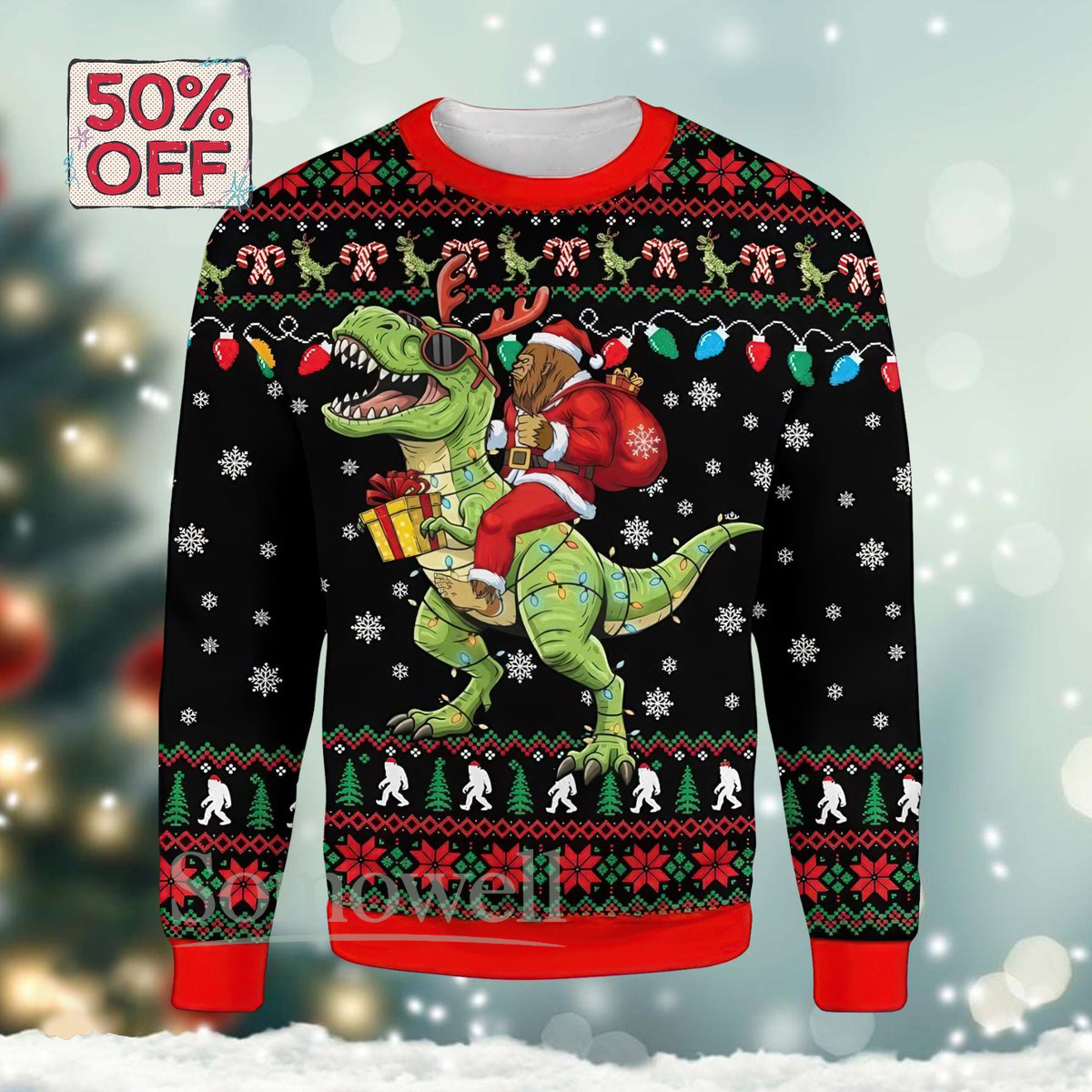 Santa Riding Dinosaur Black Ugly Christmas Sweater Funny T-Rex Gift Holiday Knit Jumper