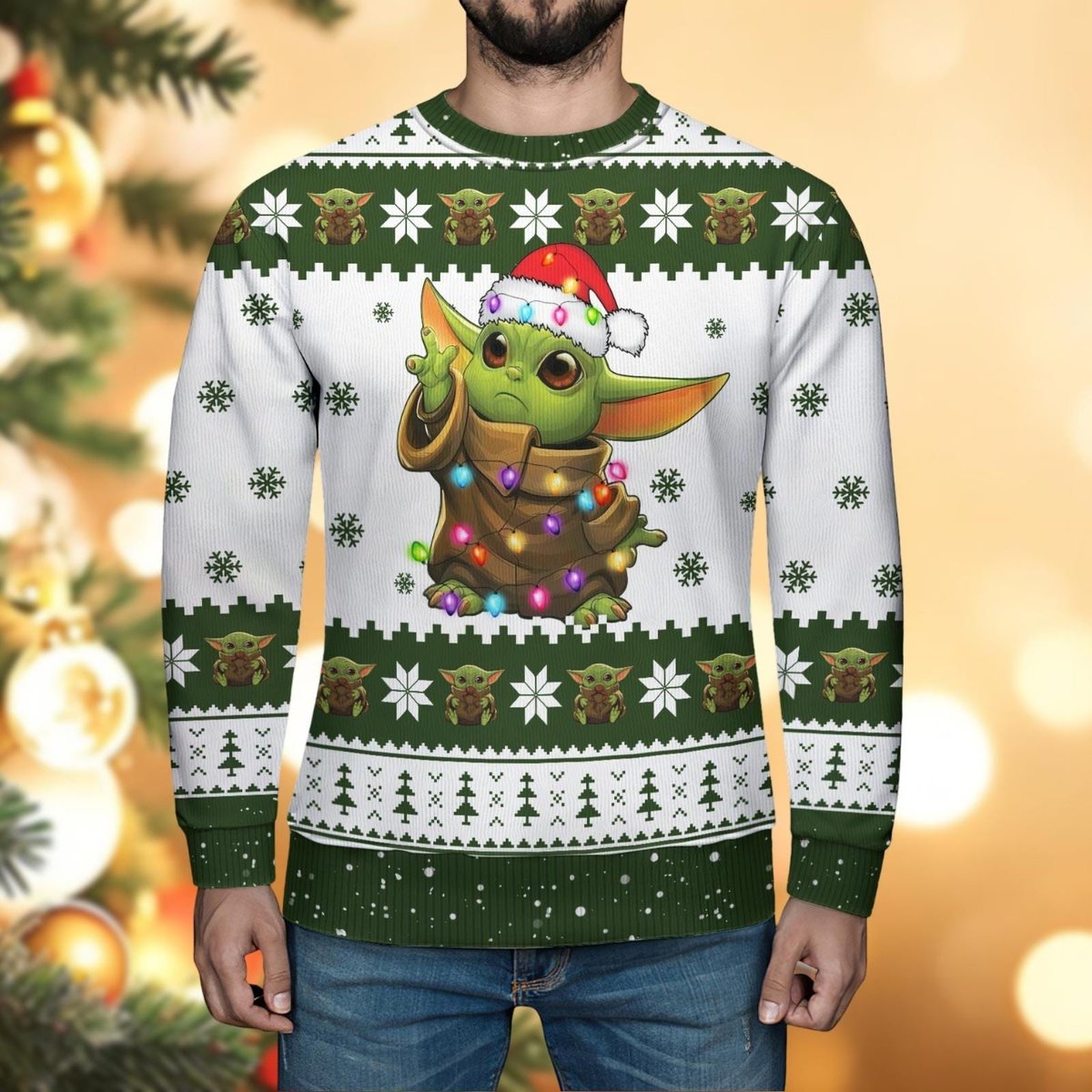 Star Wars Baby Yoda White and Green Ugly Christmas Sweater Cute Holiday Knit Jumper