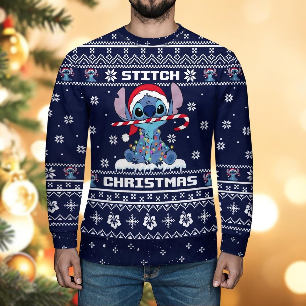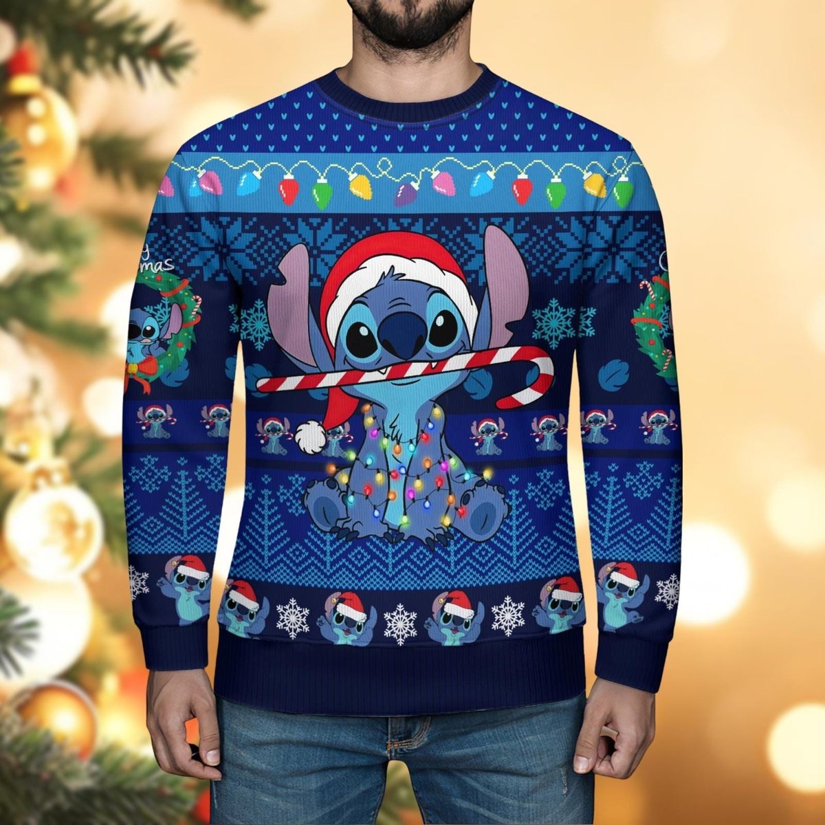 Stitch Candy Cane Lights Blue Ugly Christmas Sweater Funny Holiday Knit Gift