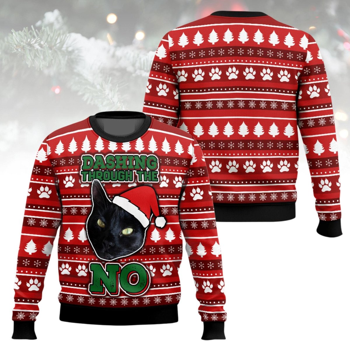 Black Cat Dashing Through The No Red Ugly Christmas Sweater Holiday Knit Gift