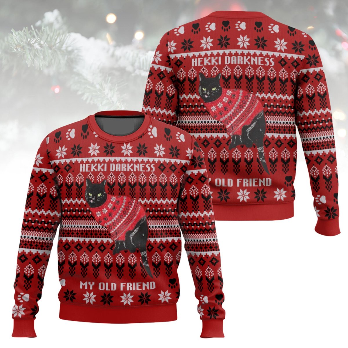Black Cat Hello Darkness Red Ugly Christmas Sweater Holiday Knit Gift
