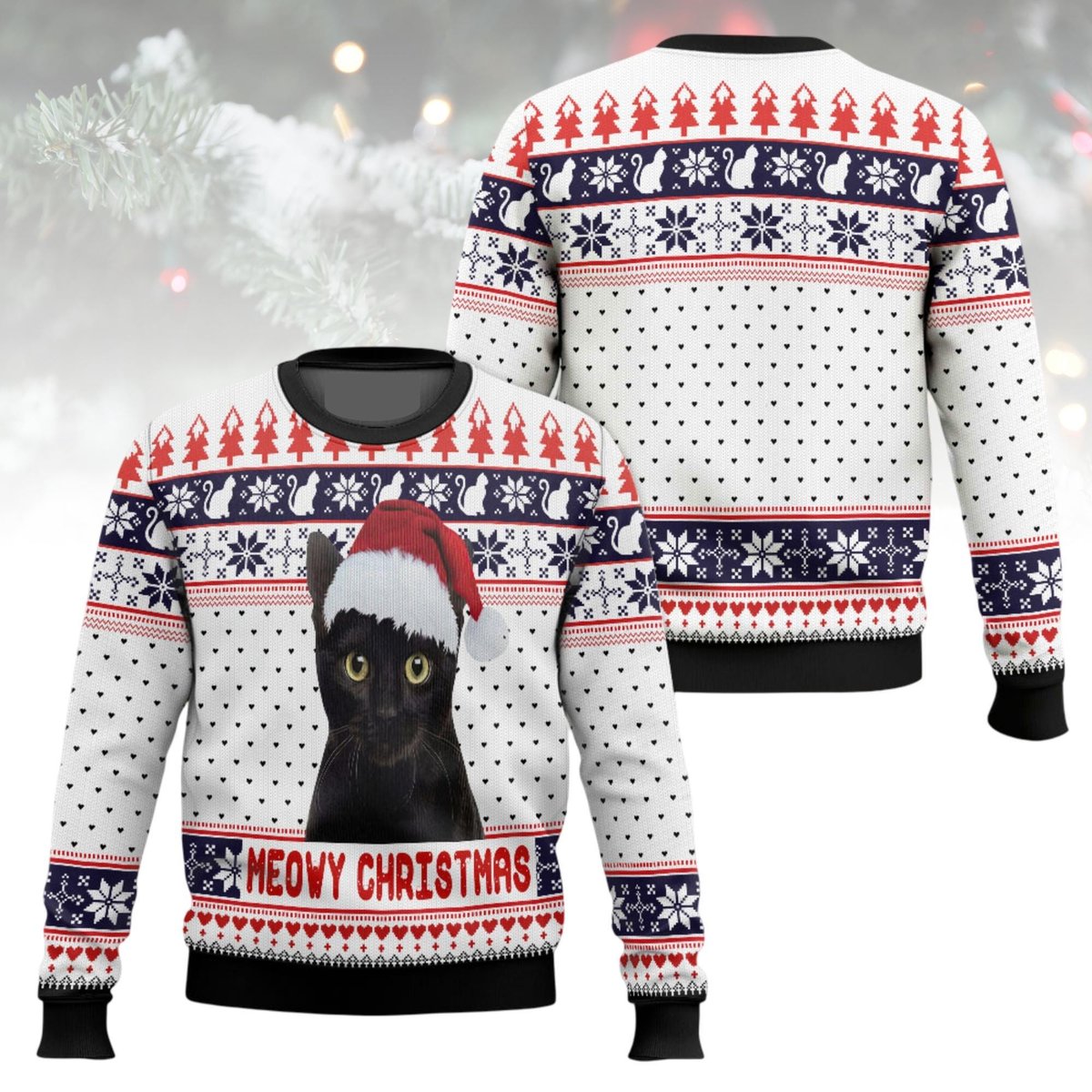 Black Cat Meowy Christmas White Ugly Christmas Sweater Holiday Knit Gift