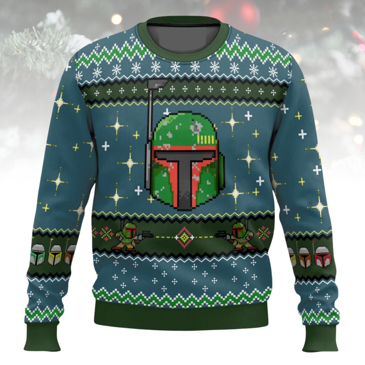 Boba Fett Helmet Green Pixel Star Wars Ugly Christmas Sweater Holiday Knit Gift
