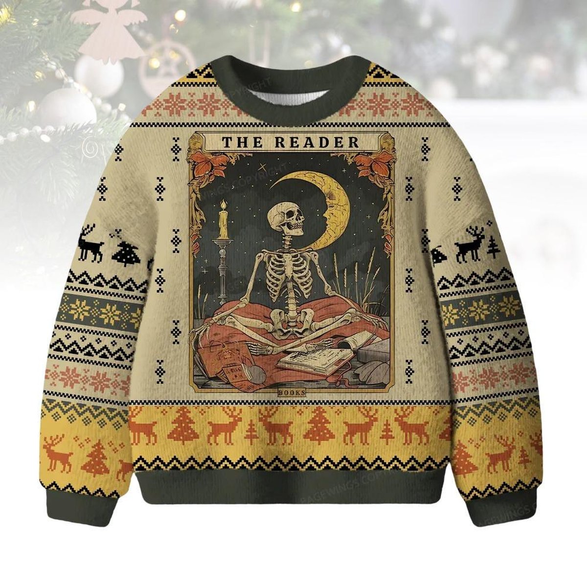 The Reader Skeleton Vintage Gothic Book Lover Ugly Christmas Sweater Holiday Pullover Gift