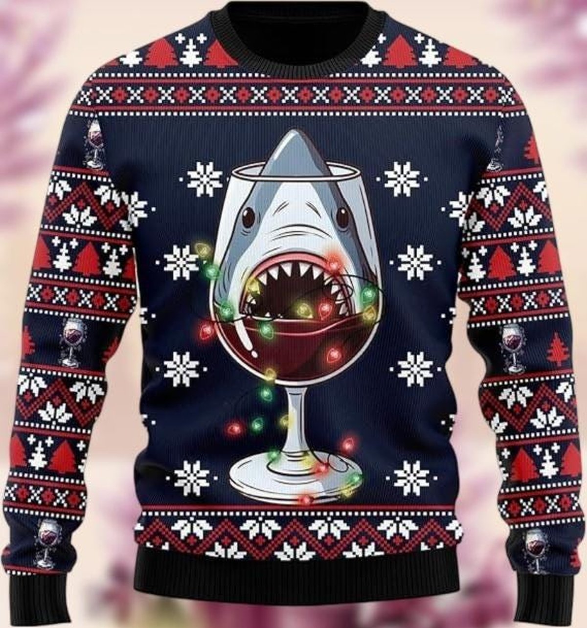 Wine Shark Christmas Navy Ugly Sweater Funny Ocean Wine Lover Holiday Knit Jumper