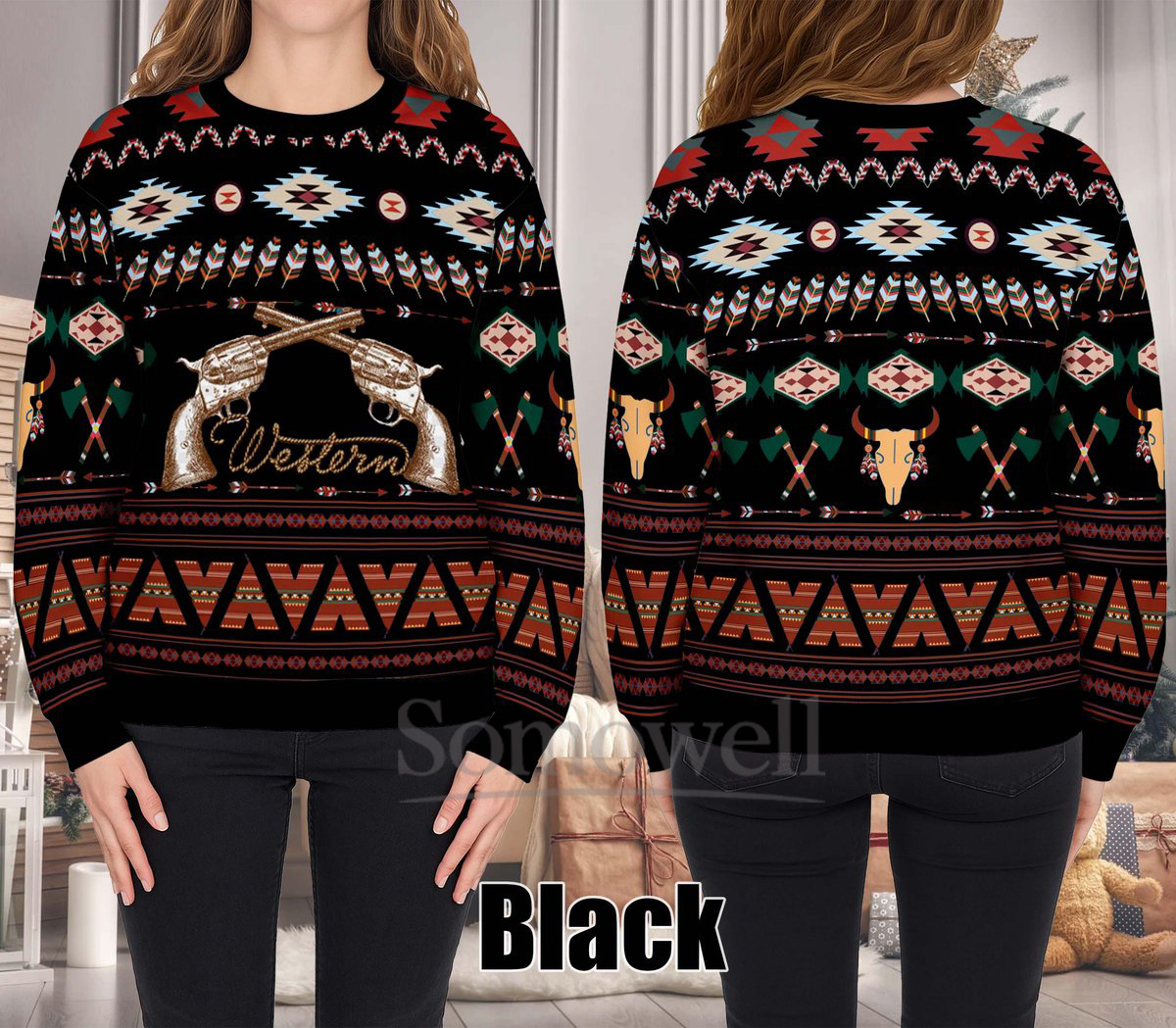 Western Cowboy Navy Ugly Christmas Sweater Guns and Skulls Aztec Holiday Knit Jumper