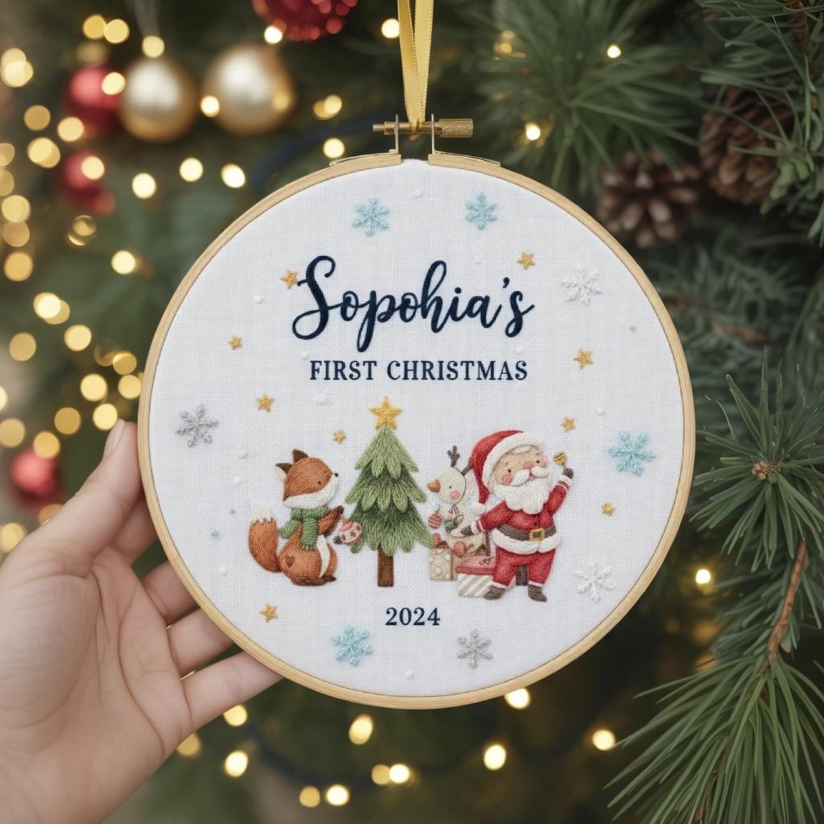 Embroidered Santa and Fox Baby39s First Christmas Ornament Handmade Holiday Decor Custom Unique Gift for New Baby Custom Christmas Gift