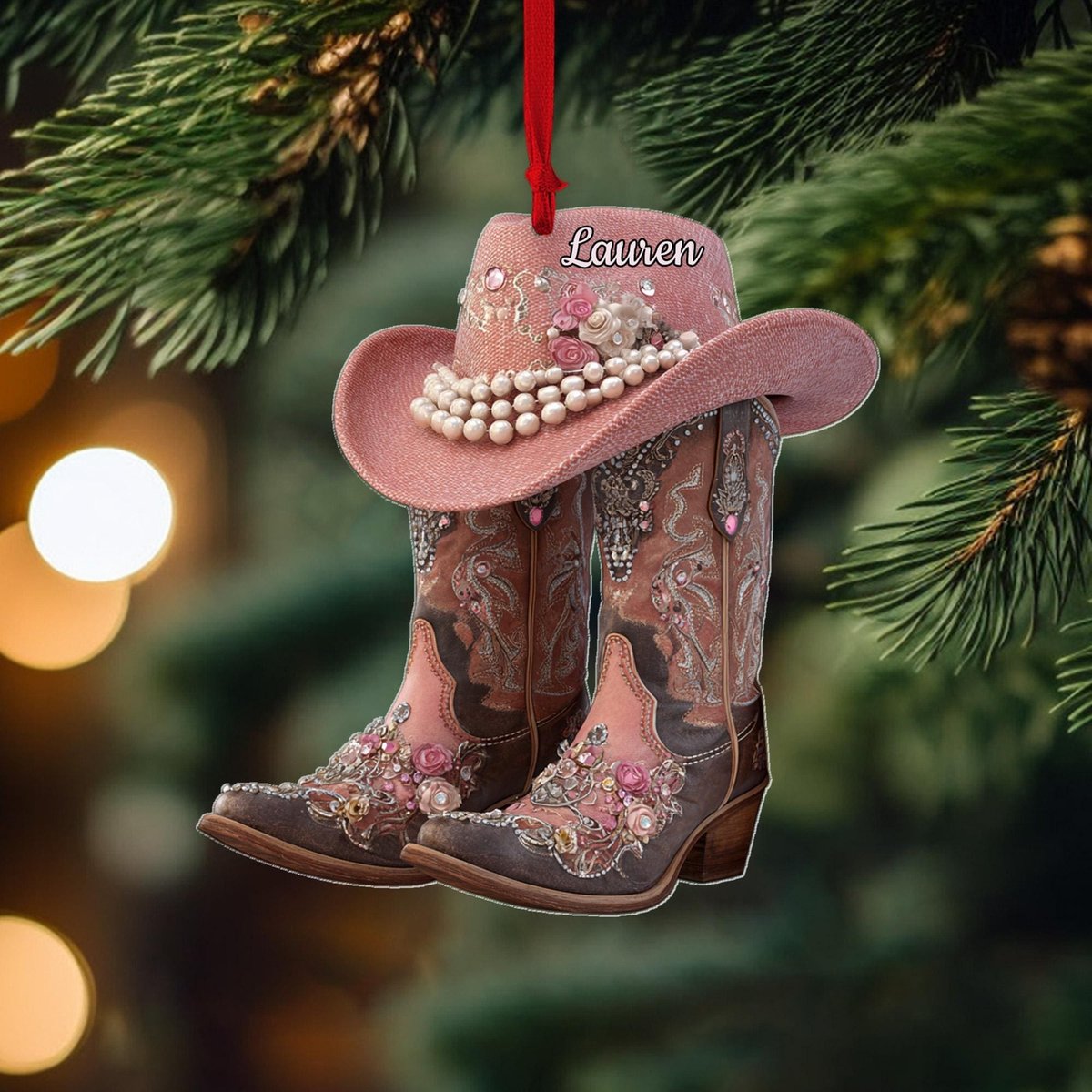 Cowgirl Boot Hat Ornament Personalized Western Christmas Tree Decoration Custom Name Country Girl Gift Rustic Rodeo Acrylic Ornamet