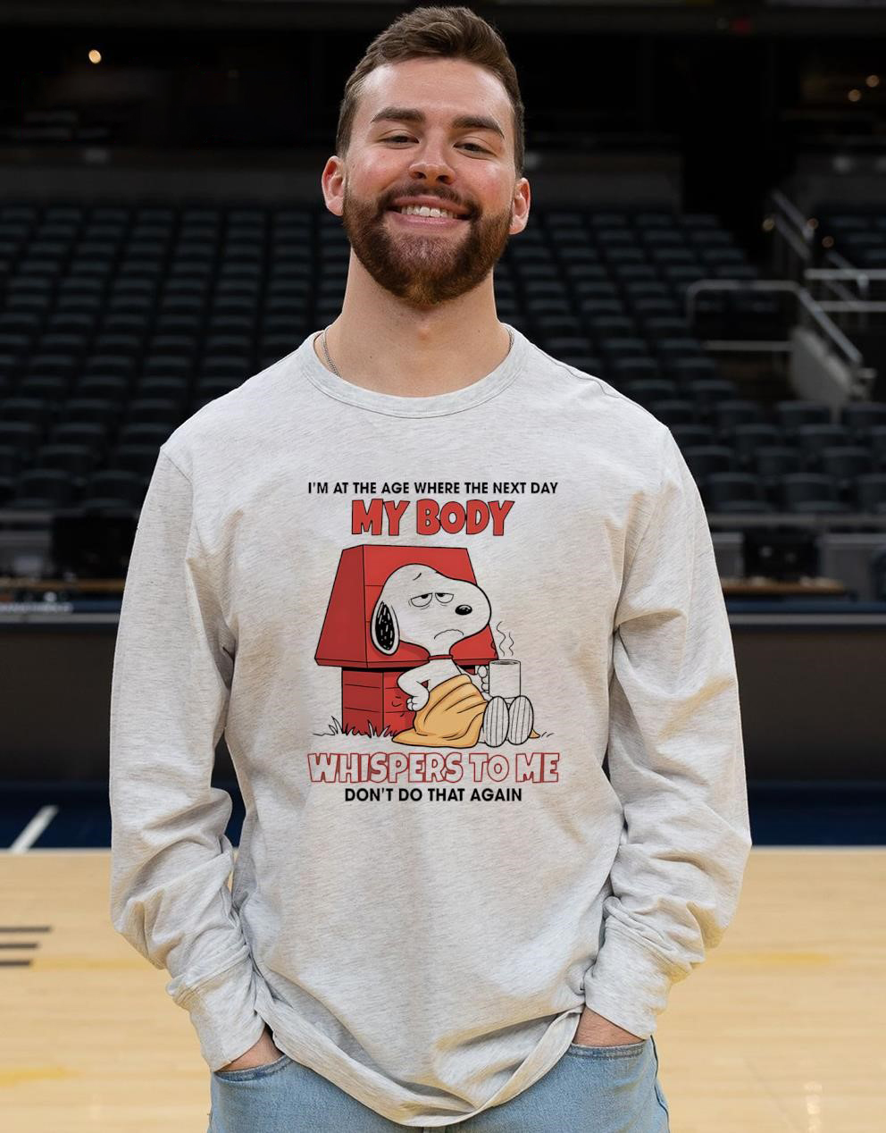 Peanuts Snoopy T-Shirt – Funny I’m At The Age Where My Body Whispers Don’t Do That Again Vintage Bootleg Aging Humor Tee