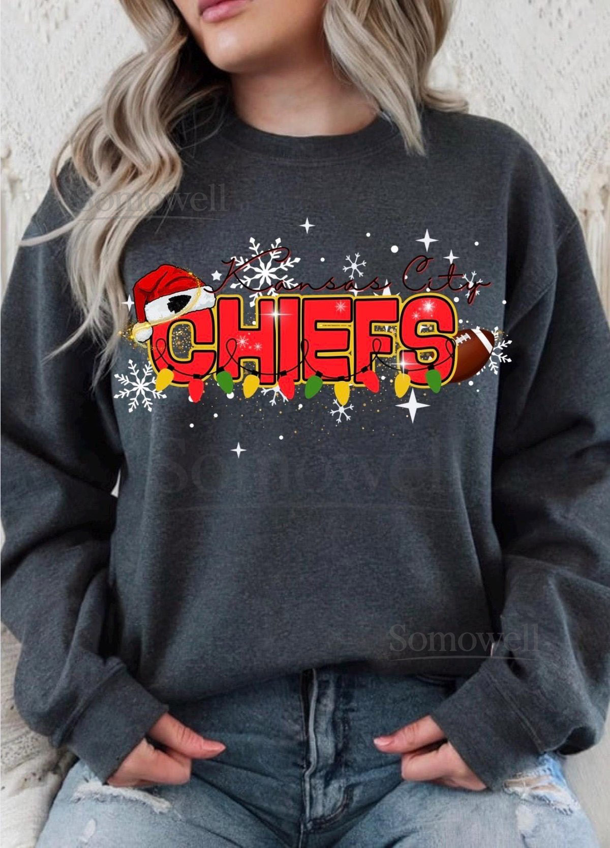 Chiefs Christmas Shirt Kansas City Chiefs Sweatshirt KC Football Holiday Tee Chiefs with Snowflakes and Christmas Lights Shirt Red Gol_4
