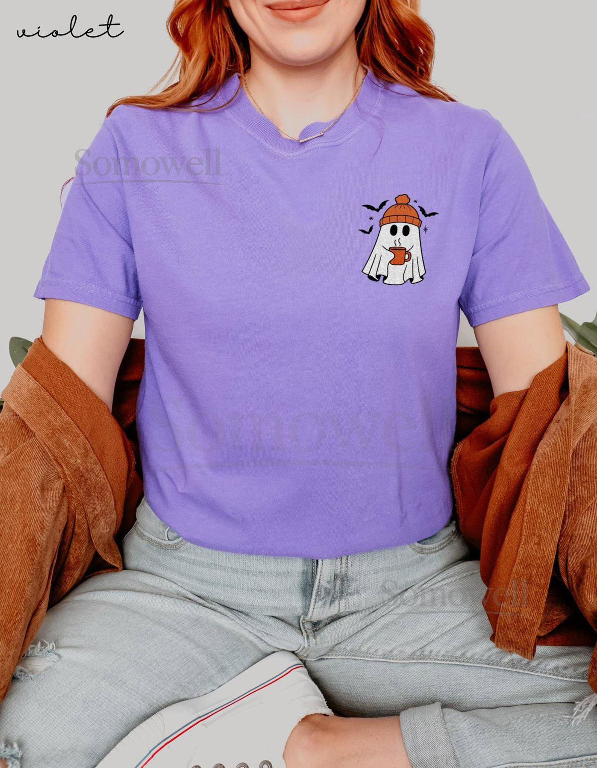 Embroidered Ghost Coffee Shirt Comfort Colors Fall Tee Halloween Cozy Ghost With Coffee Embroidery Spooky Season T-Shirt_71