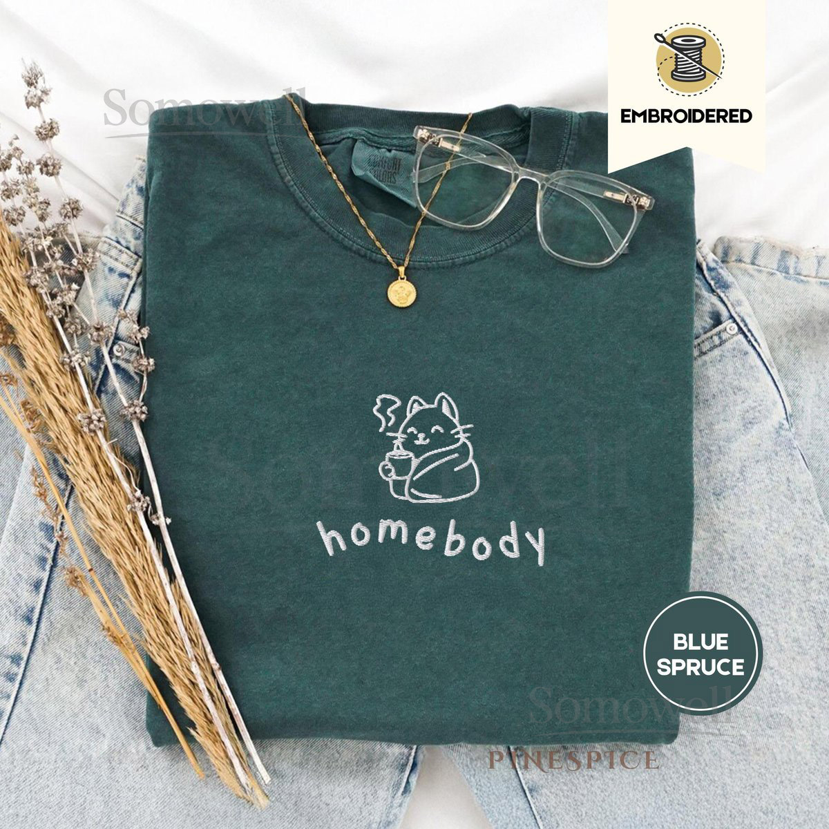Homebody Cat Embroidered Tee Comfort Colors Cozy Shirt for Cat Lovers Introvert Gift Soft Bookish Aesthetic Cozy Reader Gifts_124