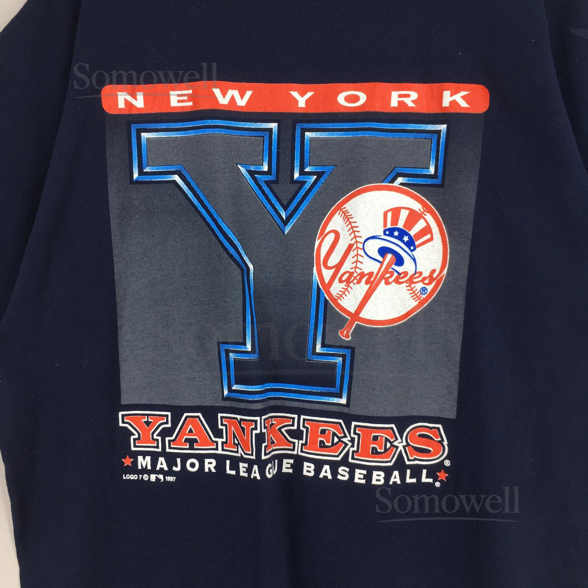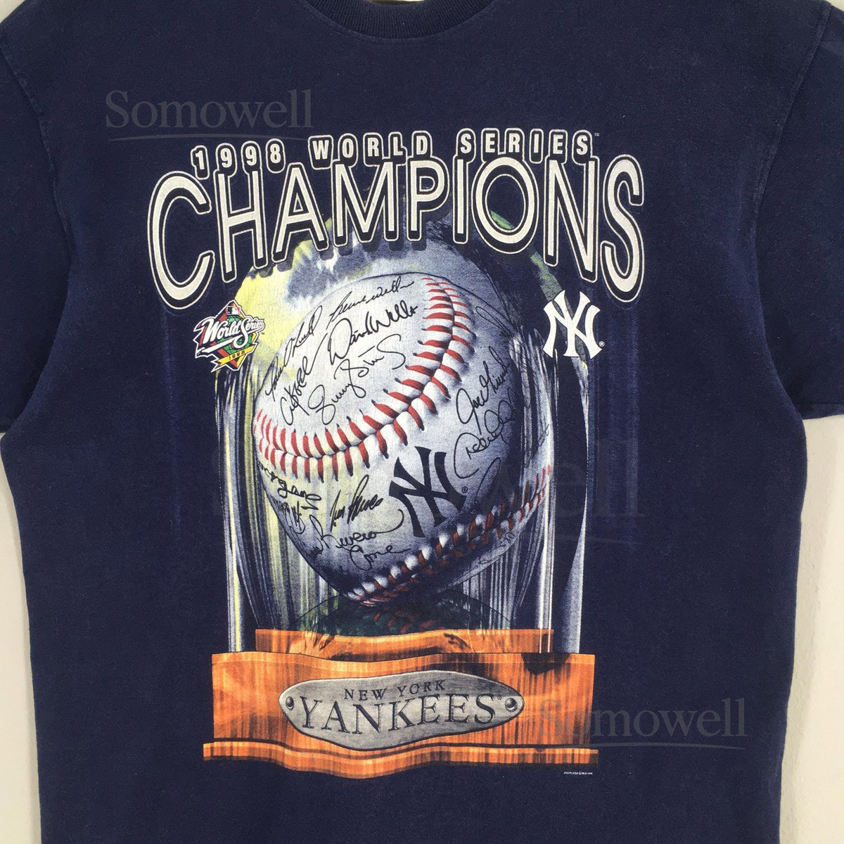 Vintage 90s New York Yankees MLB Blue T shirt XXLarge New York Yankees Printed Spell Out Jersey NY Yankees Baseball World Series Tees XXL_438