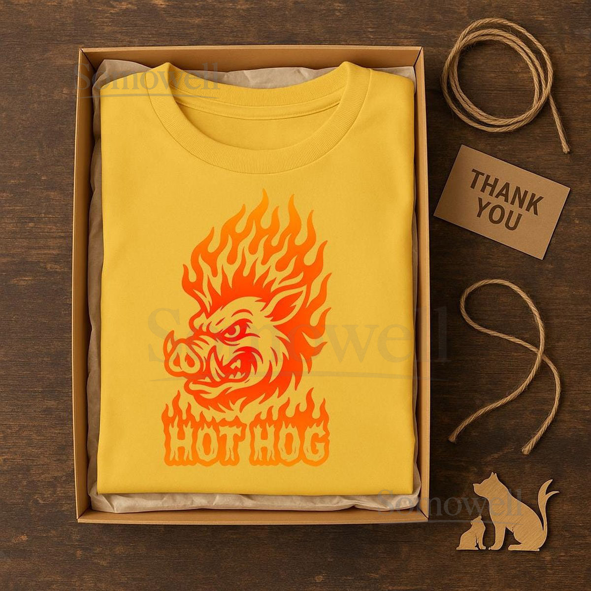 Hot Hog Graphic Tee Flaming Boar Vintage T-Shirt Unisex Yellow Shirt Cool Motorcycle Rider Gift Retro Flame Hog Tee Biker Shirt_194