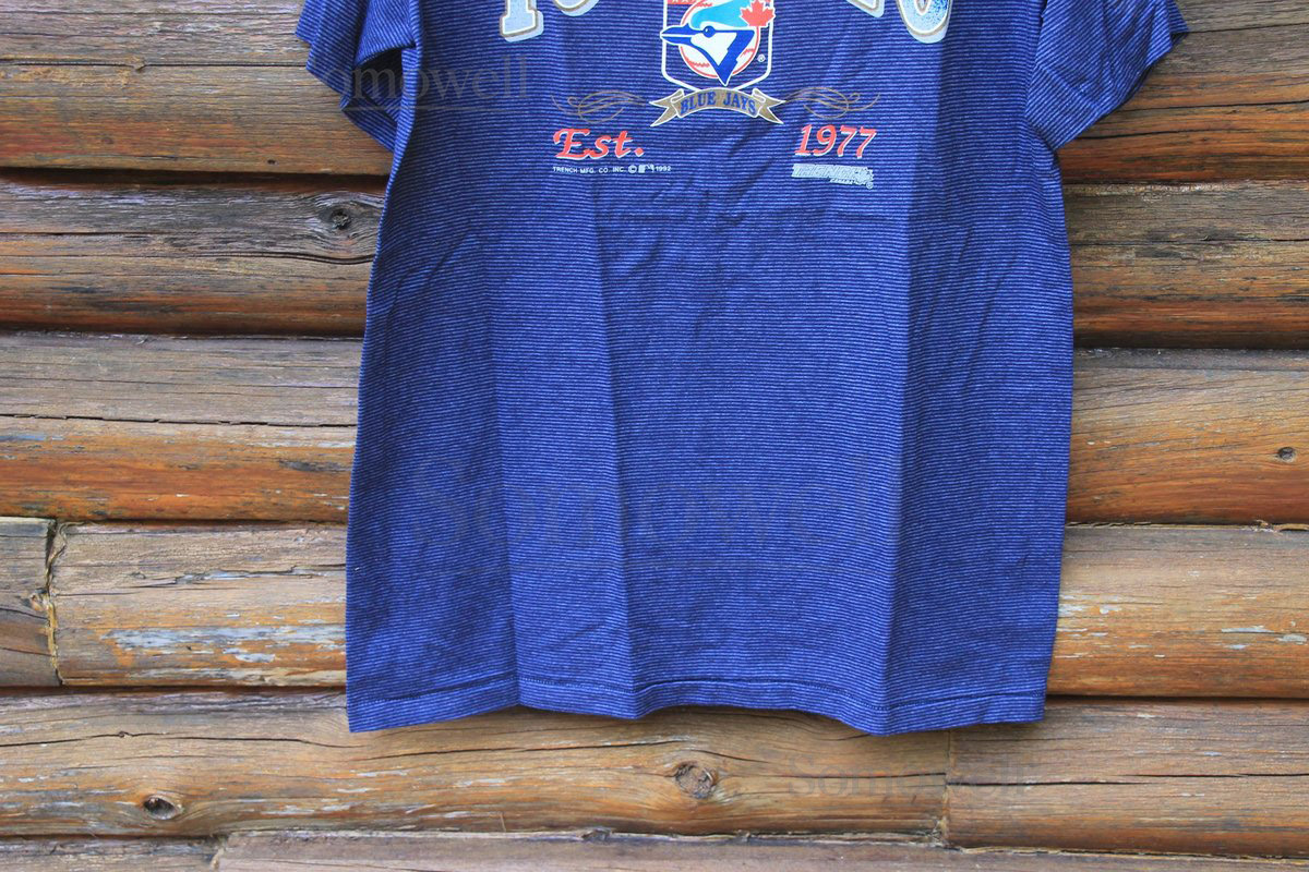 Vintage 1992 Toronto Blue Jays Trench Canada MLB Baseball Blue Single Stitch T-Shirt Adult Size Large_984