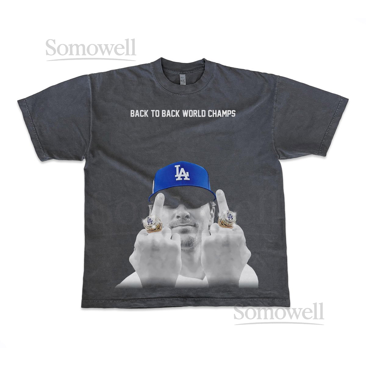 Kike Hernandez Back to Back World Series Champs 2025 Middle Finger Baseball Vintage Look Oversized Boxy T Shirt Bootleg Washed_485