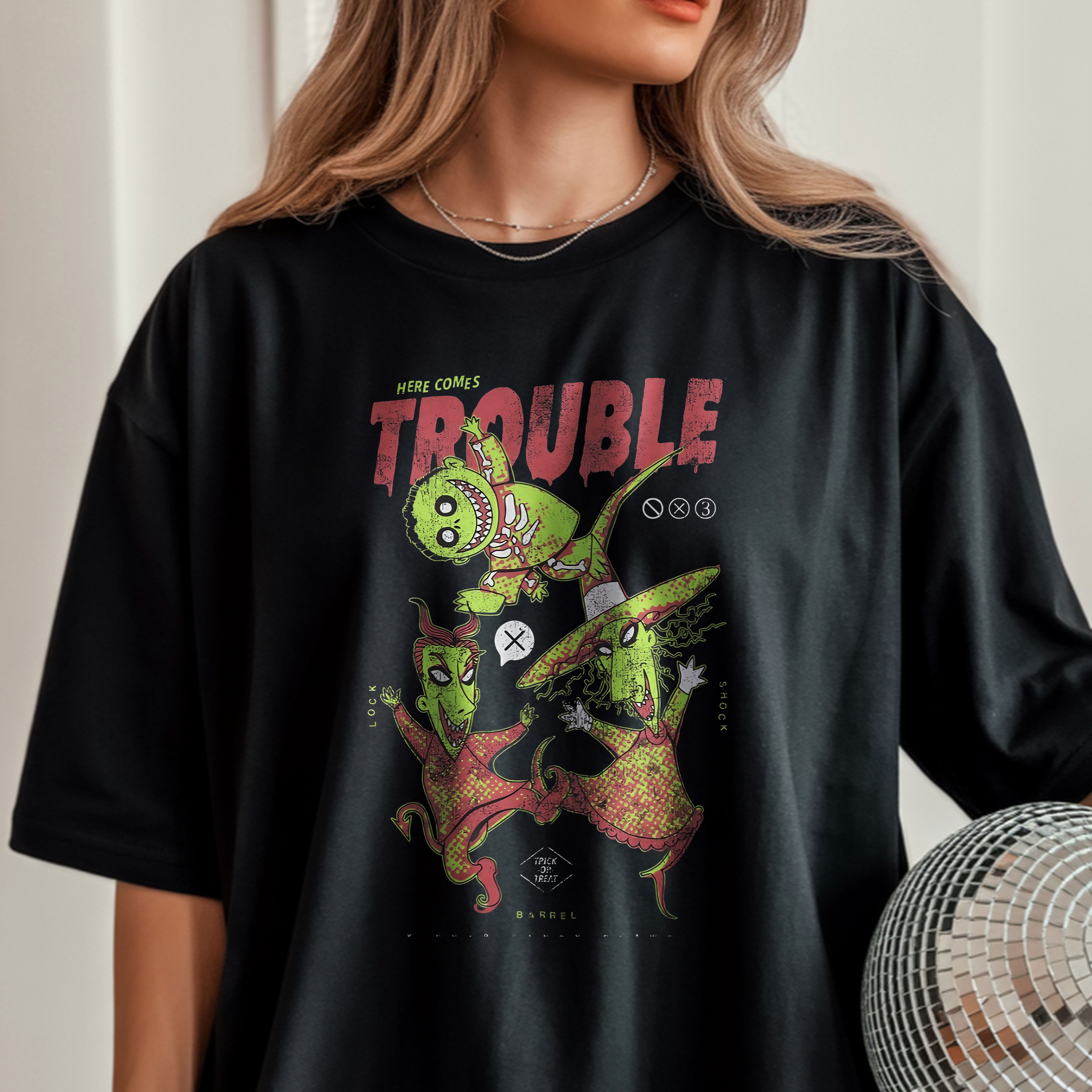 Lock Shock Barrel Trio Design Here Comes Trouble Halloween Retro T-Shirt, Hoodie & Sweatshirt