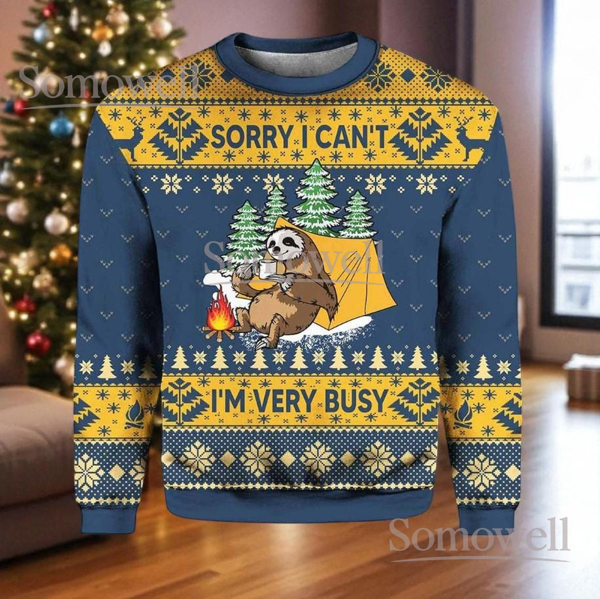 Sloth Busy Camping Christmas Blue Ugly Sweater Funny Holiday Knit Jumper