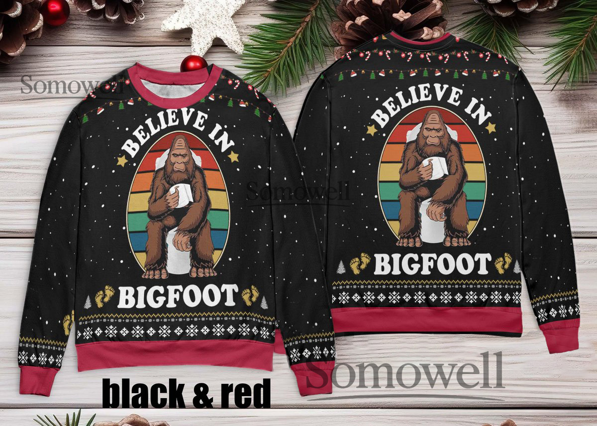 Believe In Bigfoot Ugly Christmas Sweater Personalized Forest Green Funny Holiday Sasquatch Design Multi Color Edition