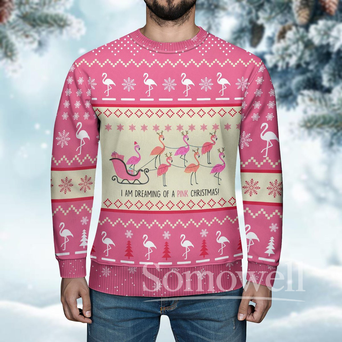 Pink Flamingo Christmas Ugly Sweater I’m Dreaming of a Pink Holiday Knit Pullover Gift