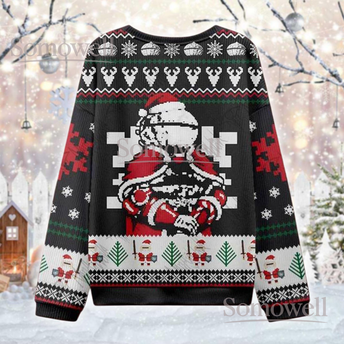 Pixel Robot Santa Black Christmas Ugly Sweater Retro Gamer Holiday Knit Jumper