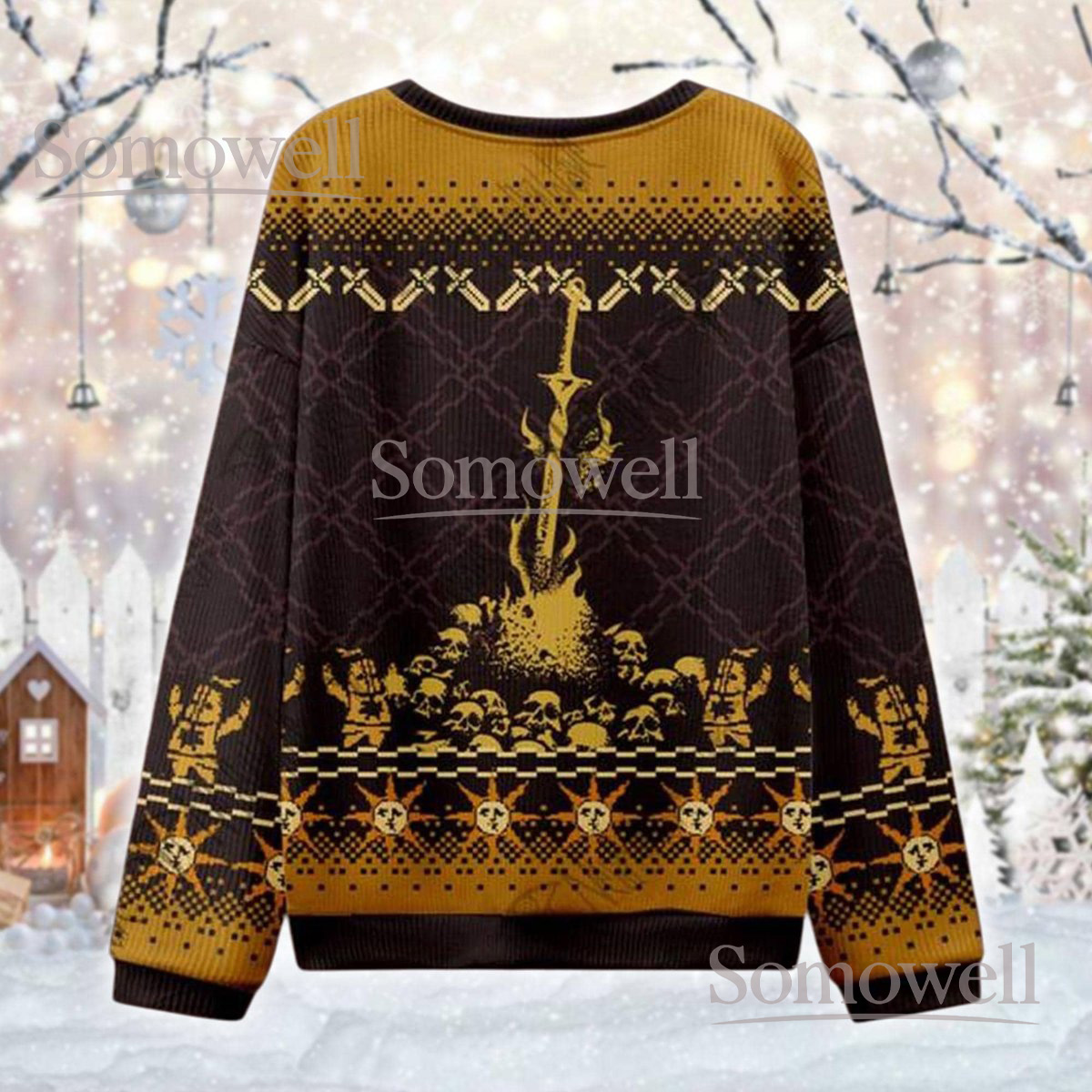 Praise the Sun Gold Brown Christmas Ugly Sweater Knight Gamer Holiday Knit Jumper