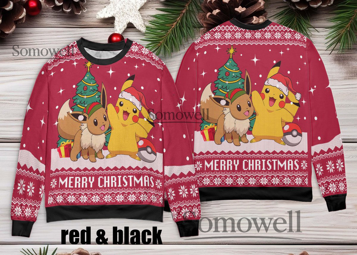 Pikachu Eevee Merry Christmas Ugly Christmas Sweater Black Red Anime Holiday Edition Multi Color Edition