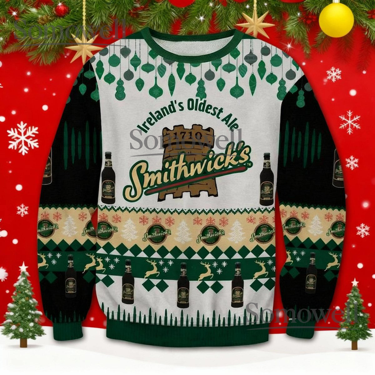 Smithwick’s Ireland Oldest Ale Green Ugly Christmas Sweater Beer Lovers Holiday Knit Jumper