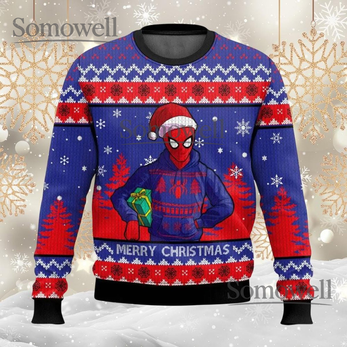 Spider Man Blue Red Ugly Christmas Sweater Funny Superhero Holiday Knit Jumper
