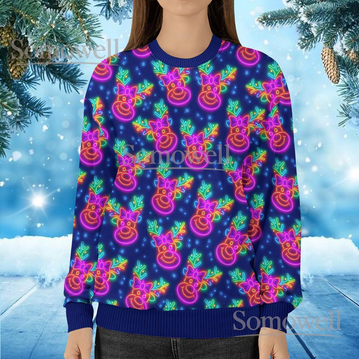 Neon Reindeer Ugly Christmas Sweater Funny Holiday Lights Print Knit Jumper Gift