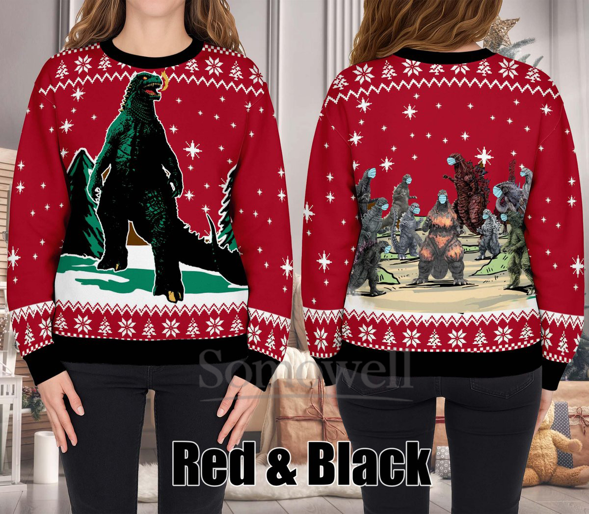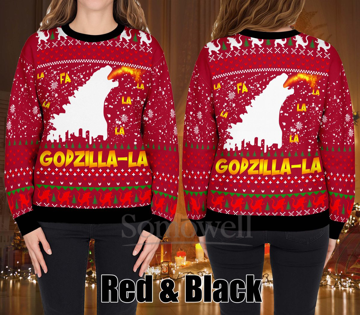 Godzilla La Ugly Christmas Sweater Funny Kaiju Movie Black Red Holiday Knit Jumper Gift