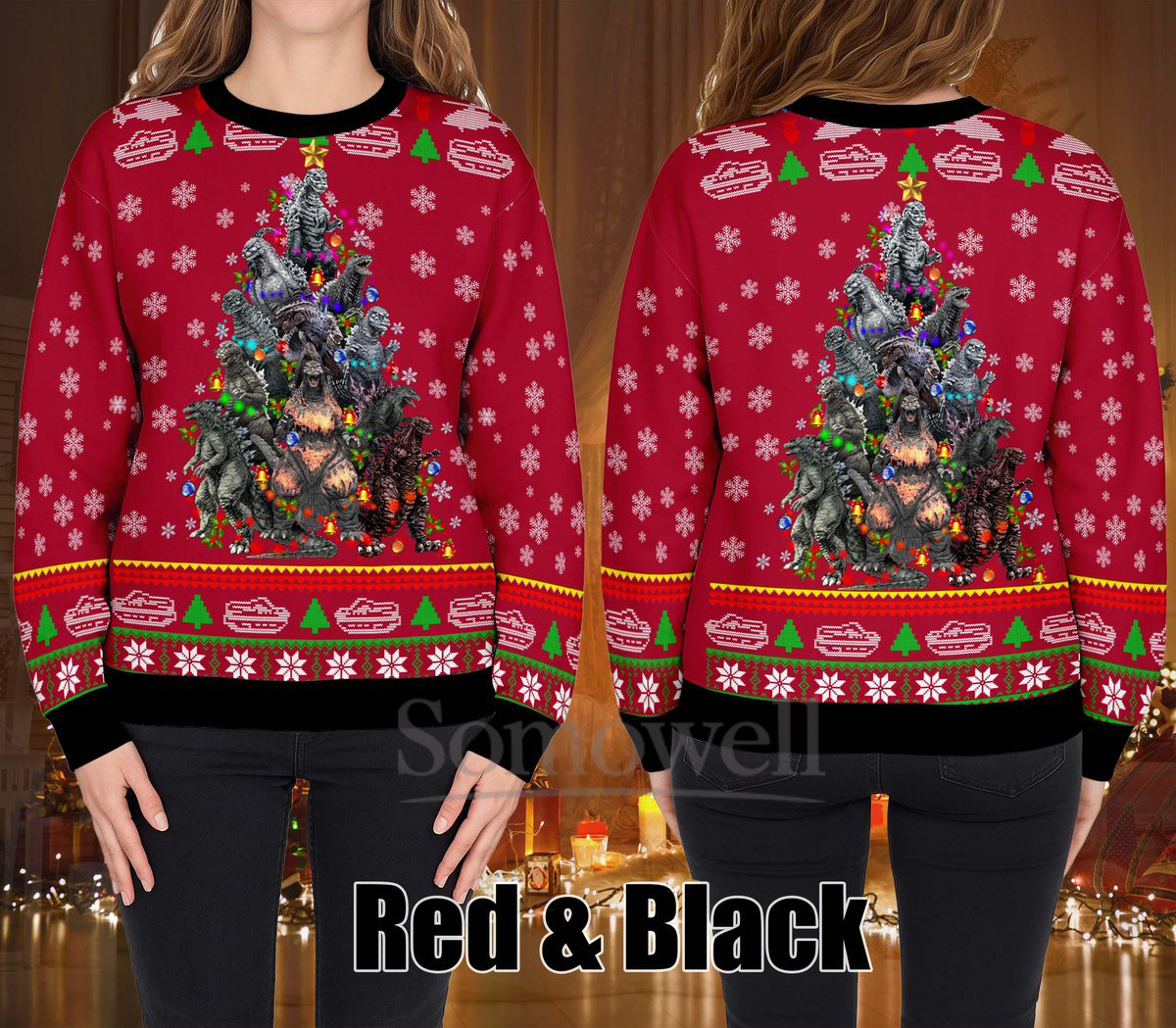 Godzilla vs Kaiju Ugly Christmas Sweater Funny Forest Black Holiday Knit Jumper Gift