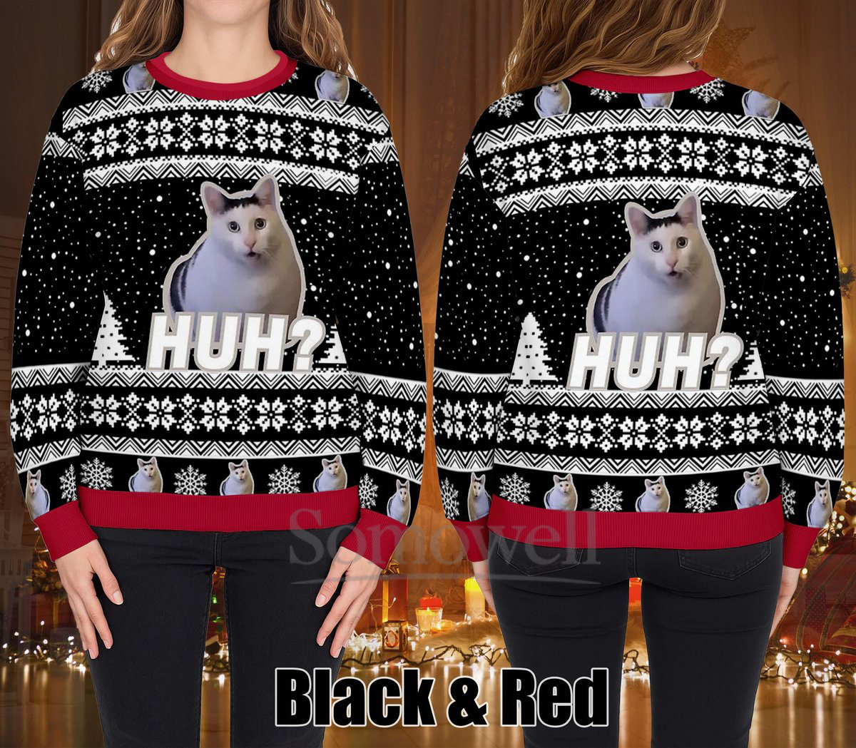 Huh Cat Meme Ugly Christmas Sweater Funny Red Holiday Knit Jumper Gift for Cat Lovers