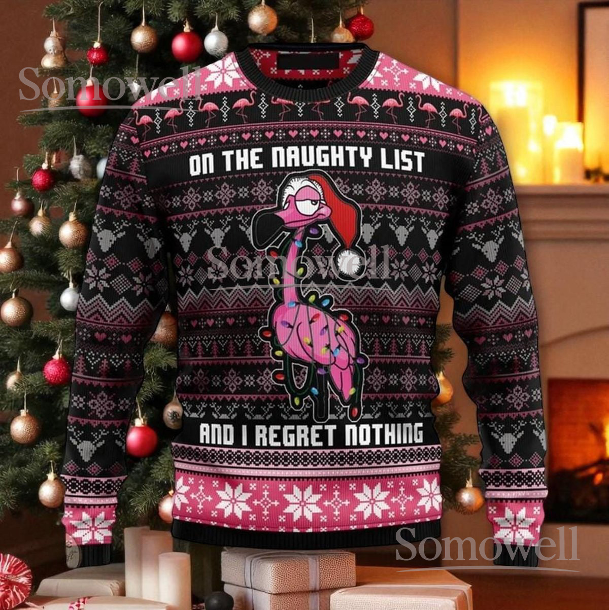 Naughty Flamingo Christmas Black Ugly Sweater Funny Party Holiday Knit Jumper
