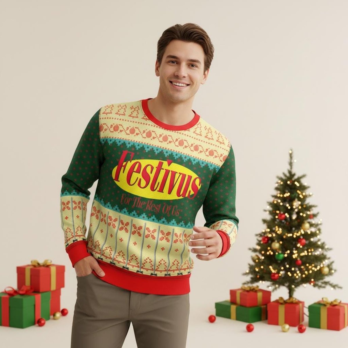 Festivus For The Rest Of Us Seinfeld Ugly Christmas Sweater Green Yellow Holiday Knit Jumper