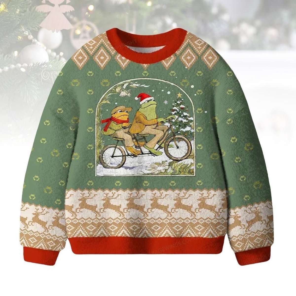 Frog and Toad Bicycle Green Ugly Christmas Sweater Whimsical Cozy Holiday Knit Jumper