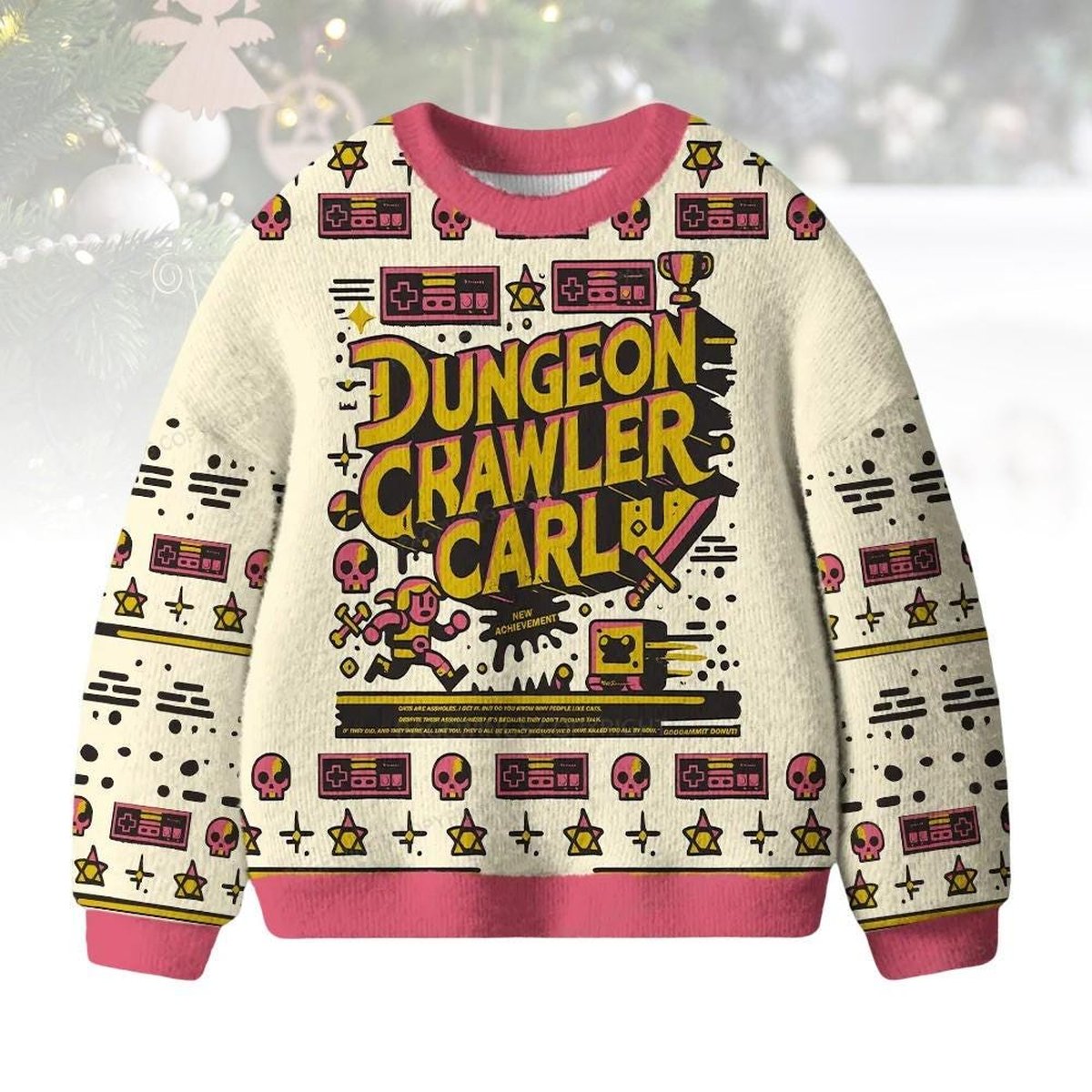Dungeon Crawler Carl Beige Ugly Christmas Sweater Retro Gamer Funny Holiday Knit Jumper