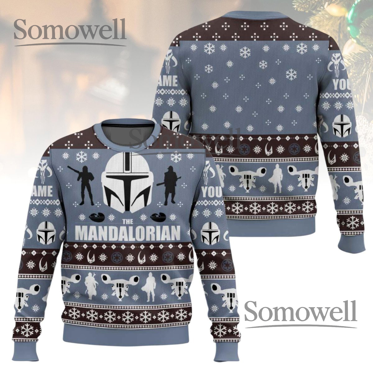 The Mandalorian Helmet Custom Name Ugly Christmas Sweater Blue Holiday Knitwear