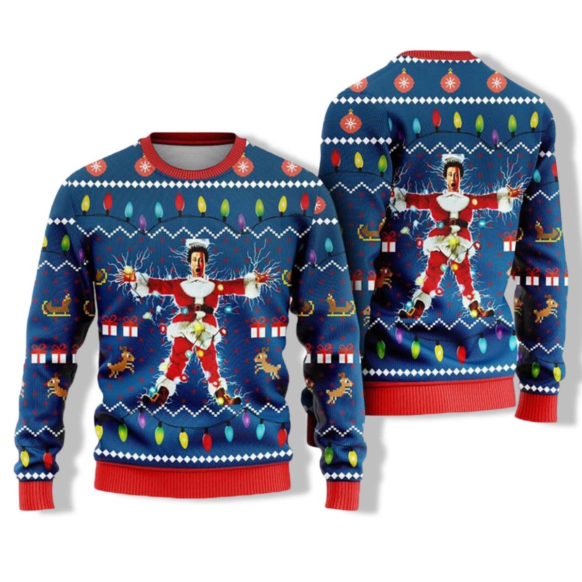National Lampoon’s Christmas Vacation Funny Electric Shock Ugly Sweater Blue Red Jumper