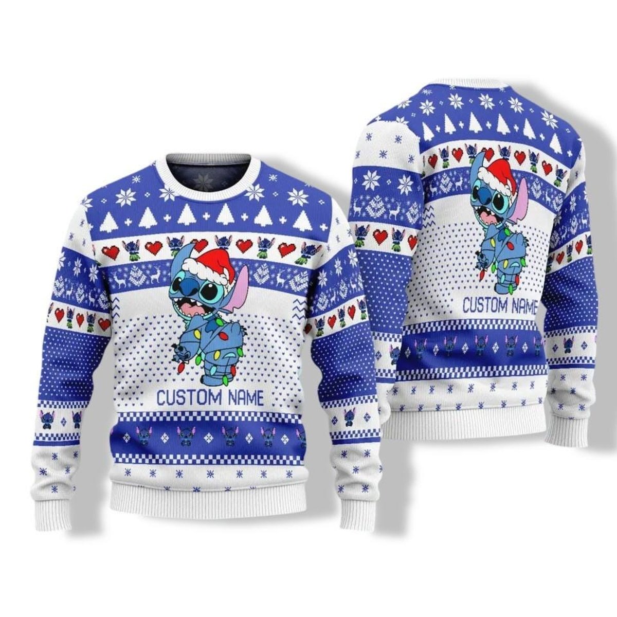 Disney Stitch Christmas Custom Name Ugly Sweater Blue White Cute Jumper