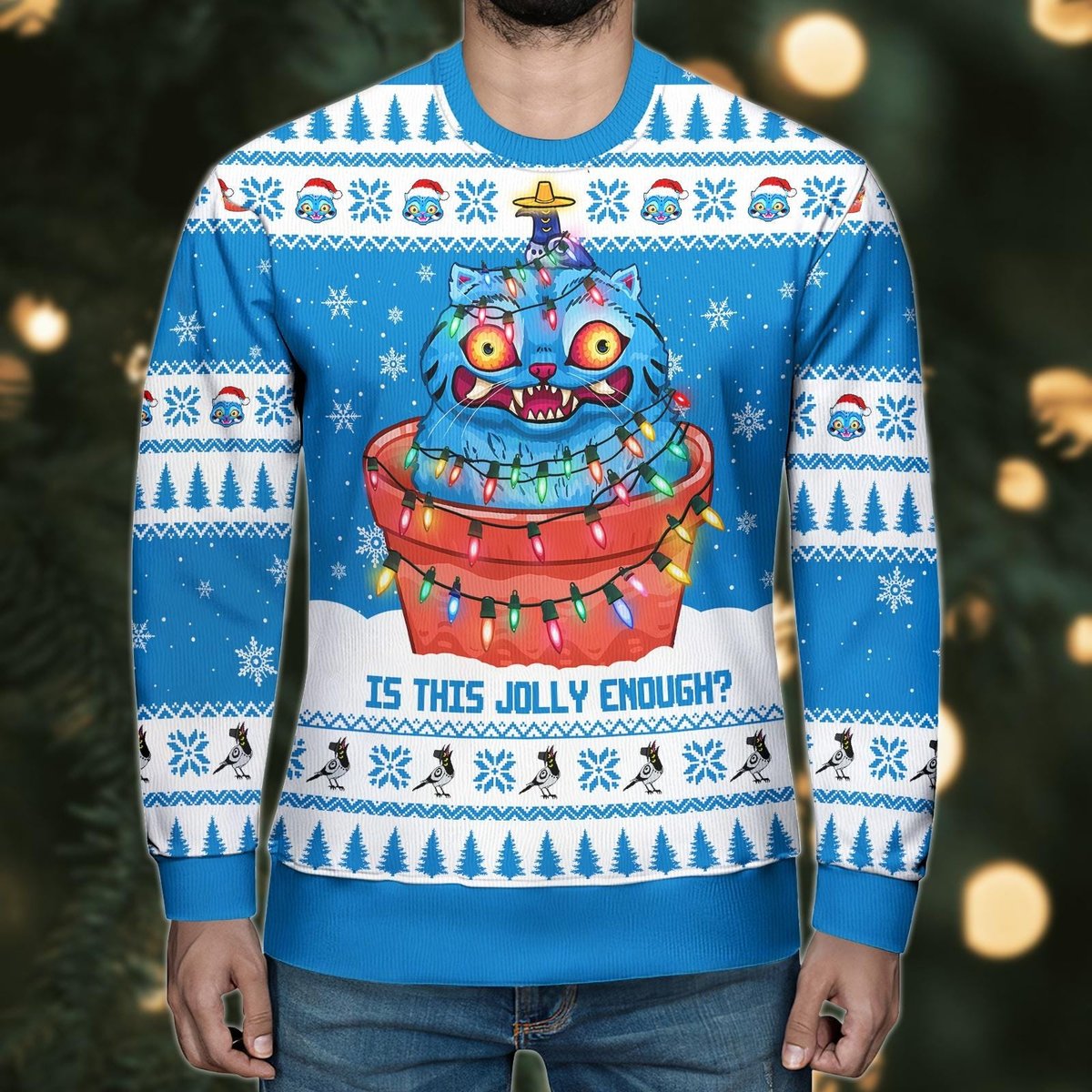 Is This Jolly Enough Funny Crazy Cat Ugly Christmas Sweater Blue Holiday Jumper