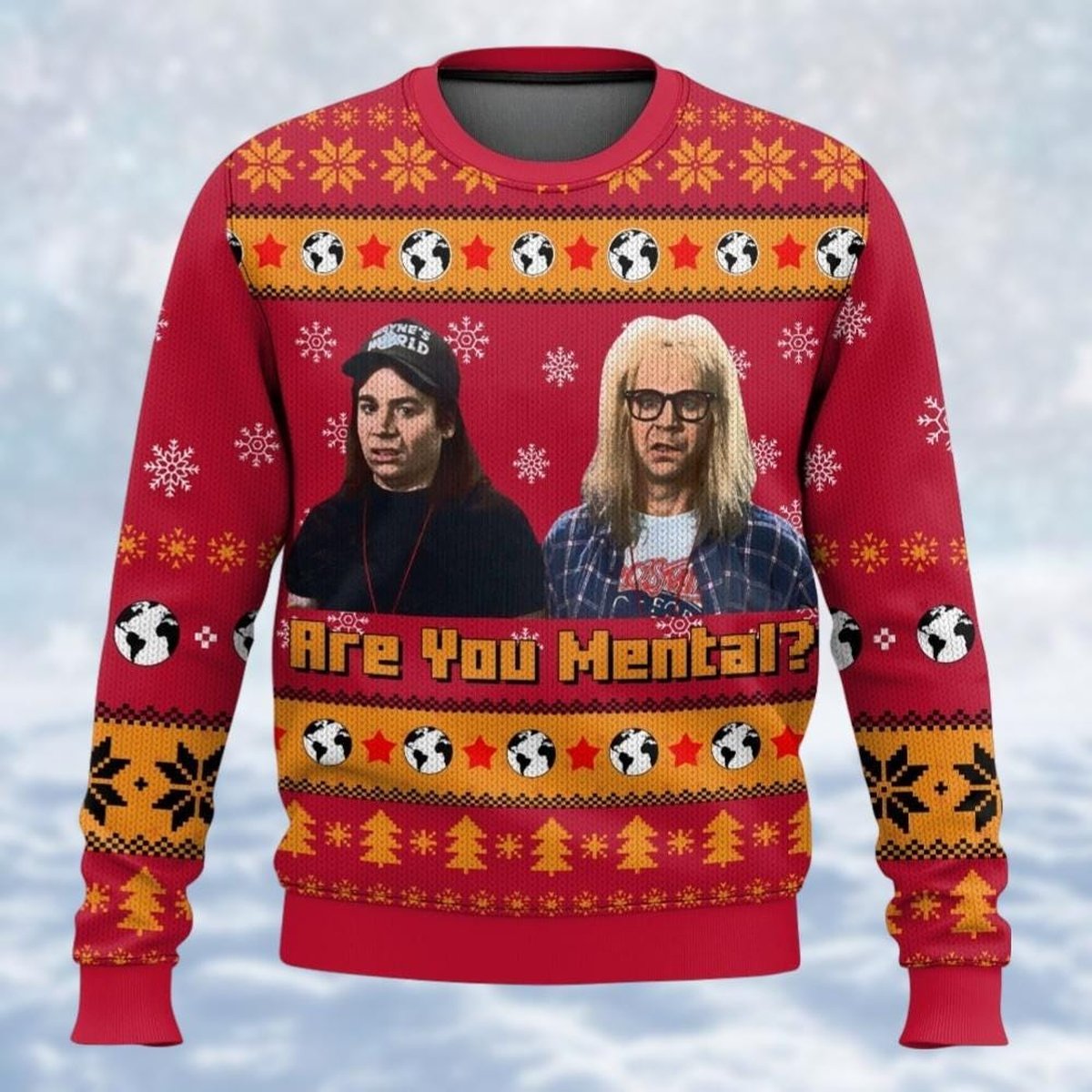 Wayne’s World Red Christmas Ugly Sweater Are You Mental Funny Movie Holiday Knit Jumper