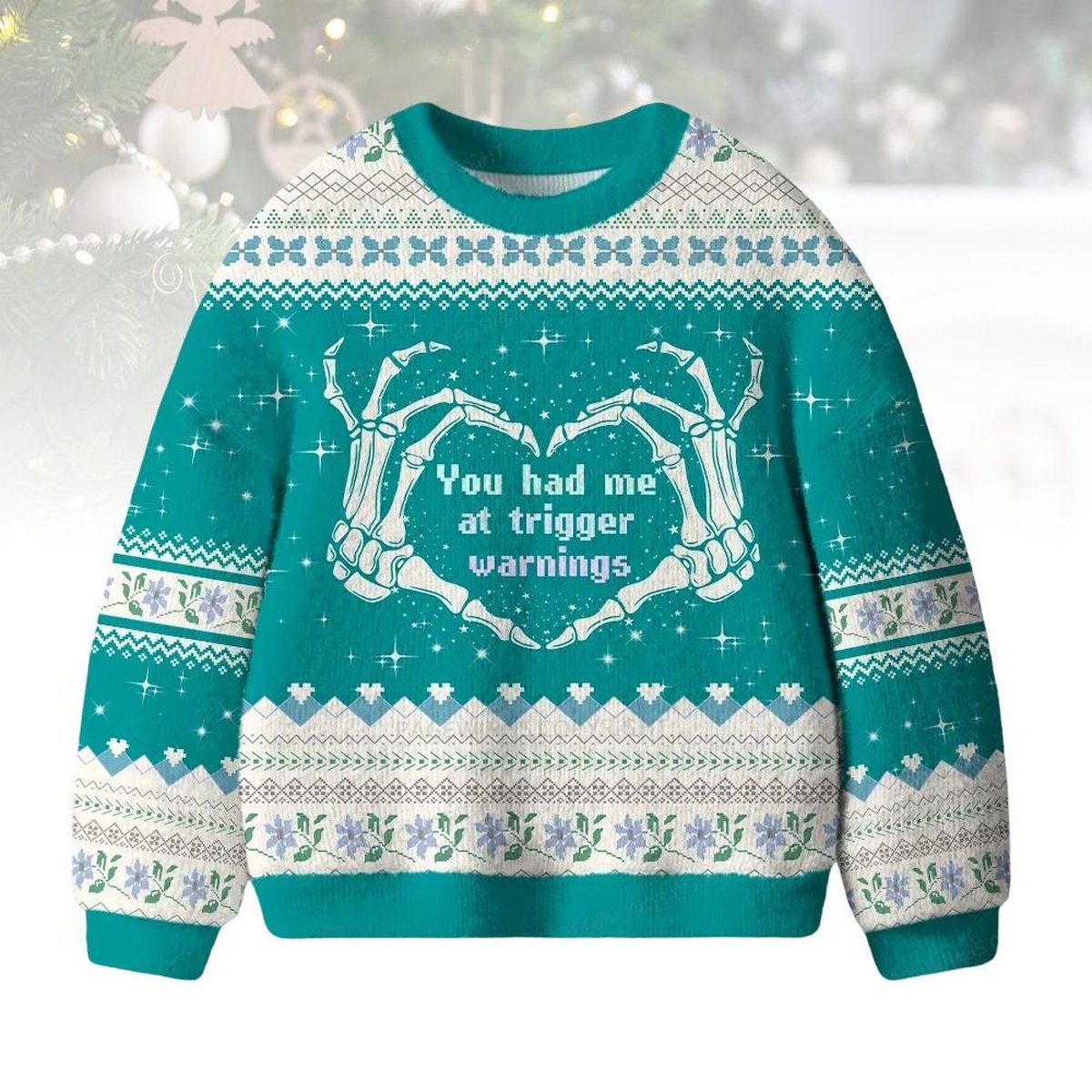 You Had Me At Trigger Warnings Skeleton Hands Ugly Christmas Sweater Funny Holiday Gift