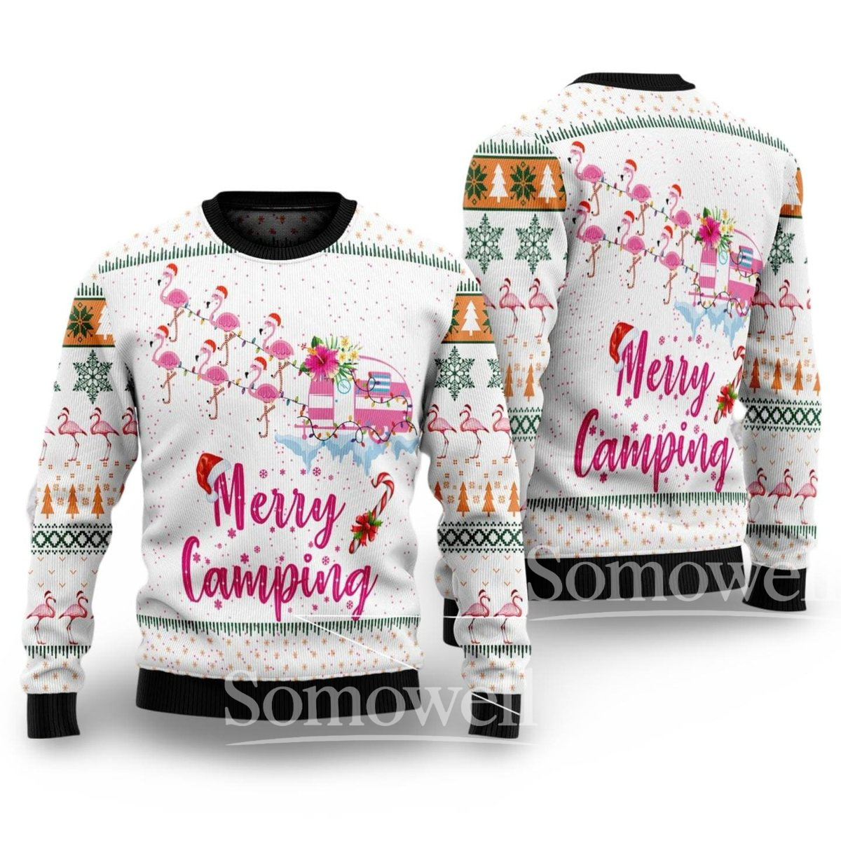 Merry Camping Ugly Christmas Sweater Flamingo Camper Holiday Knit Pullover Gift