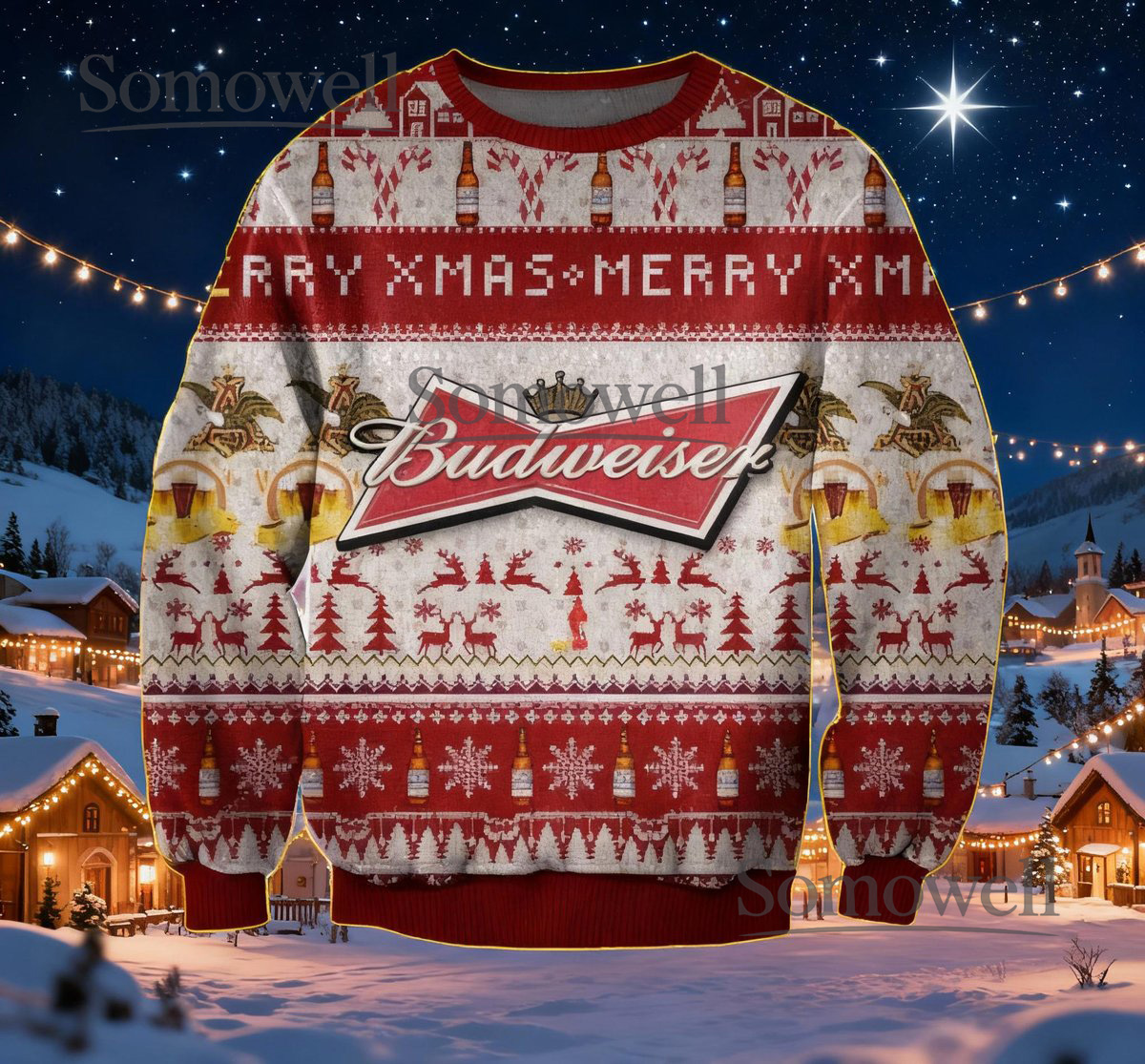 Budweiser Red White Ugly Christmas Sweater Merry Xmas Beer Holiday Knit Jumper